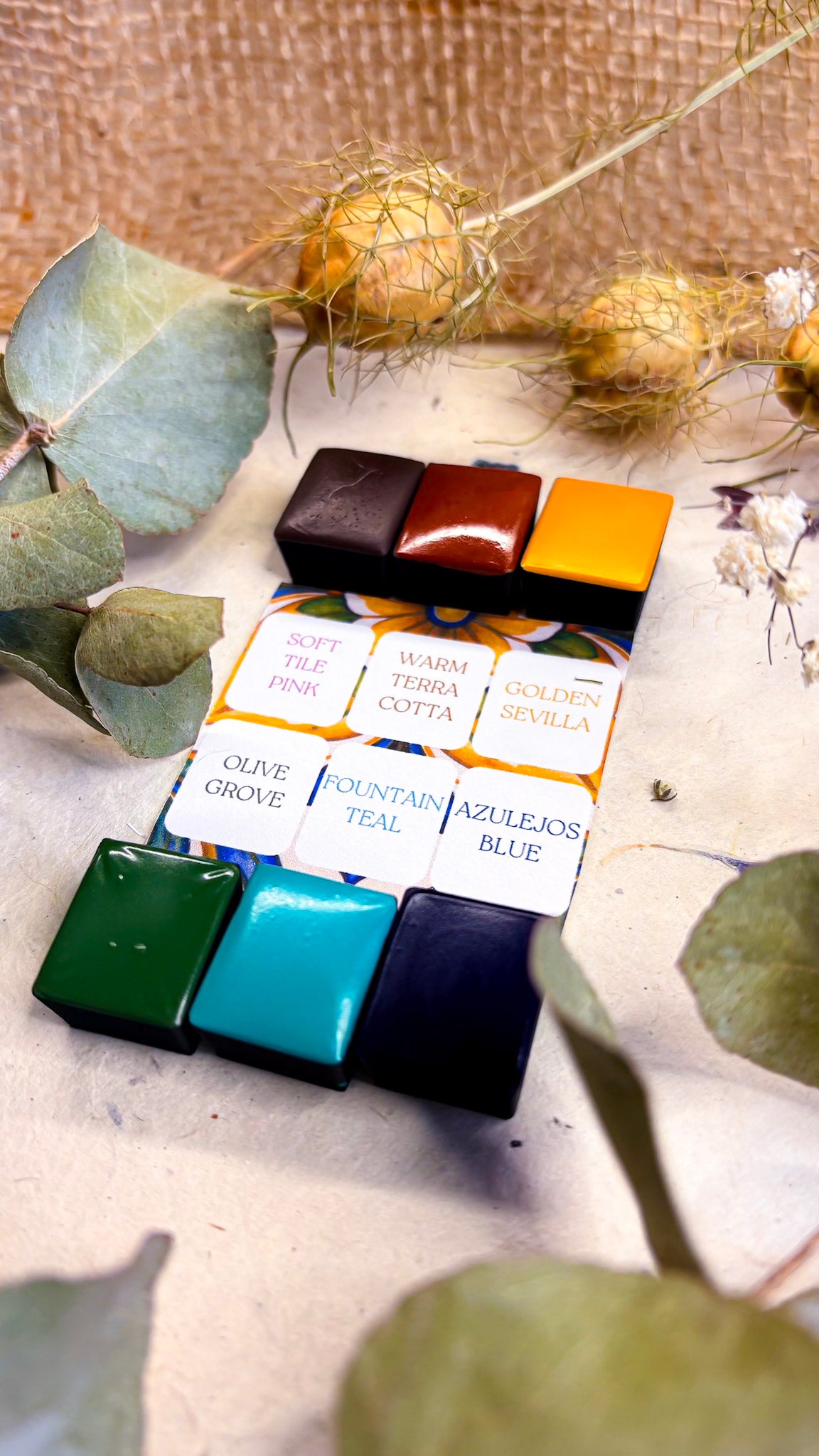 Each set includes 6 handmade watercolour half pans and 5 exclusive colouring cards printed on watercolour paper so you can paint, swatch and play with the palette straight away.