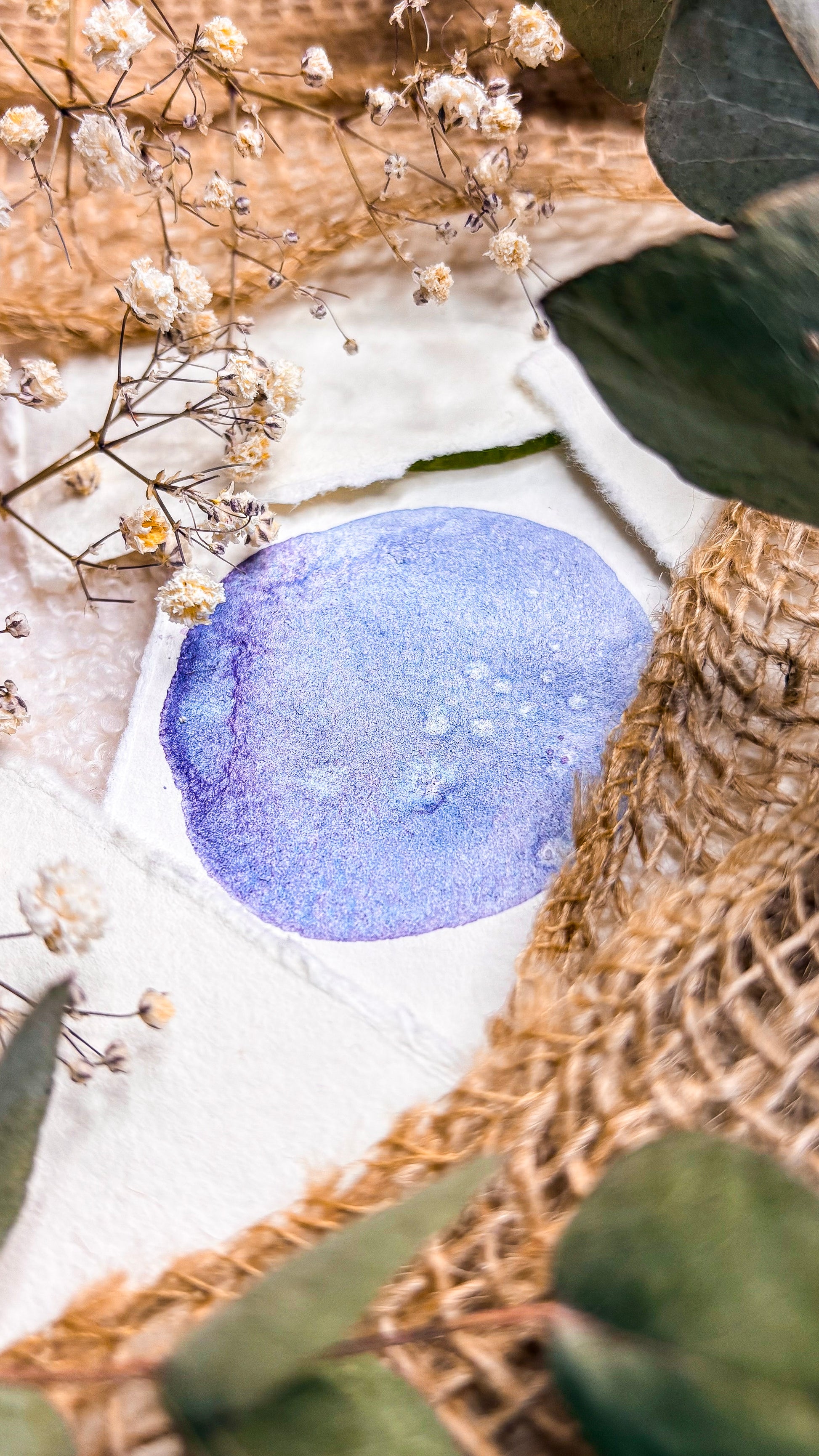 Impulse Buy is a rich, dramatic purple made with PV16 and PB36, created for those who love seperation. This handmade watercolor lays down bold violet washes that separate beautifully, revealing cool blue and purple tones as it dries.